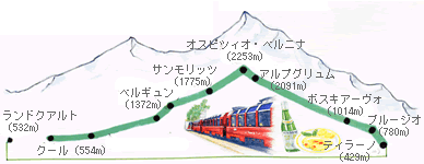 サンモリッツ ~ ティラノ<イタリア>まで結ぶスイス東部を走る路線 レーティッシュ鉄道 ベルニナ線 変化に富んだ風景が楽しめる「アルプスで一番」と謳われる景色の美しさで 有名な路線。360度旋回する円形の橋「ループ橋」、氷河、アルプス、 湖畔の風景、断崖絶壁と変化に富んだ風景が楽しめる 「アルプスで一番」と云われ列車。 氷河特急でクールやサンモリッツまで 旅したら、そのまま続けてベルニナ特急へ! ![]() (所要約 2時間) |
