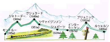 鉄道のマスコットキャラクターは、テディベア。 子連れの旅行なら特に見逃せない登山列車。 山頂にはスイス人のコレクションであるテディベア1600体が遊ぶ 「Teddy Land」もある。 (所要約 ---時間) |