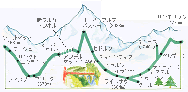 ツェルマット~サンモリッツを 平均時速35kmでゆっくりと結ぶ。 アルプスの美しい自然を堪能。 スイスを代表する観光路線。 <残念なのは、2010/07末に 列車人身事故が発生した事> 2007年5月から 広~い大型窓から眺望を満喫できる新型パノラマ車両も運行。 ユングフラウ鉄道と並ぶ最も人気がある路線。 車内説明は日本語他 6ヶ国語と充実 ![]() (所要約 8時間) |