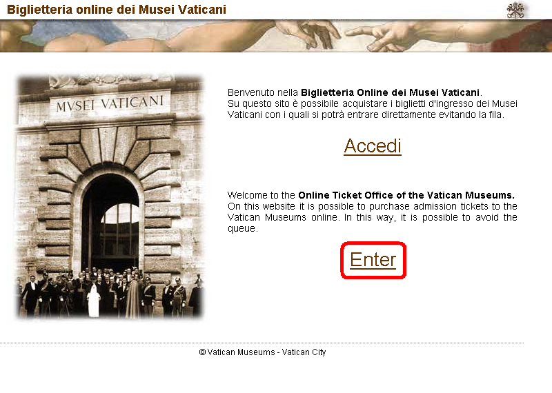 | ② | ようこそバチカン博物館のオンラインチケットオフィスへ。イタリア語<上段>、英語<下段>で 表示される。 <Enter>を クリック。 |