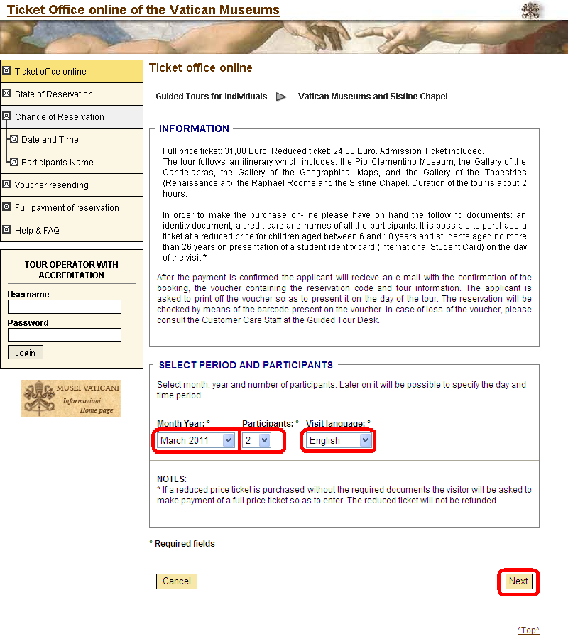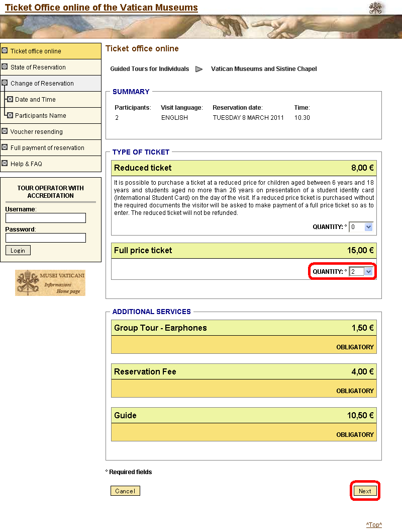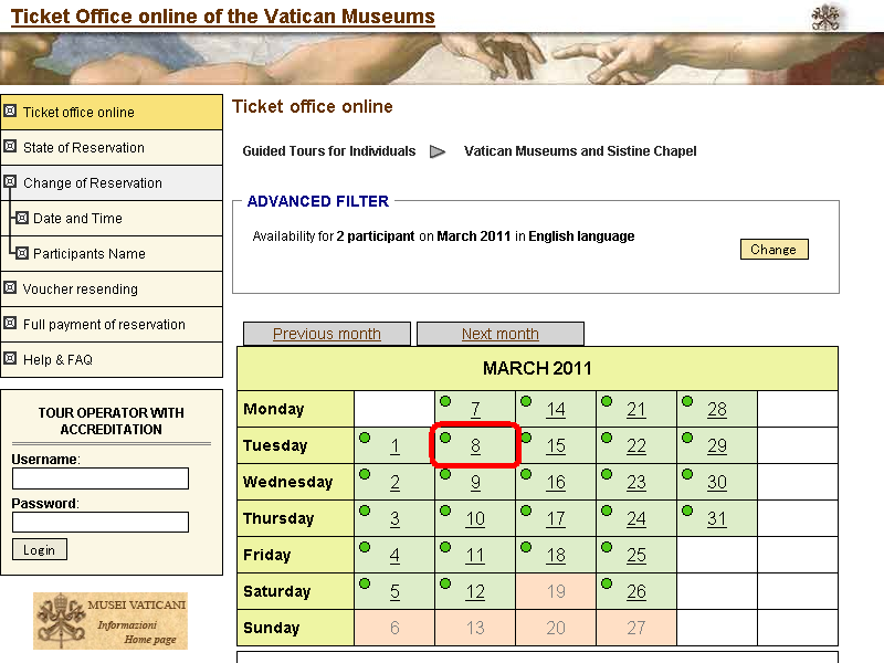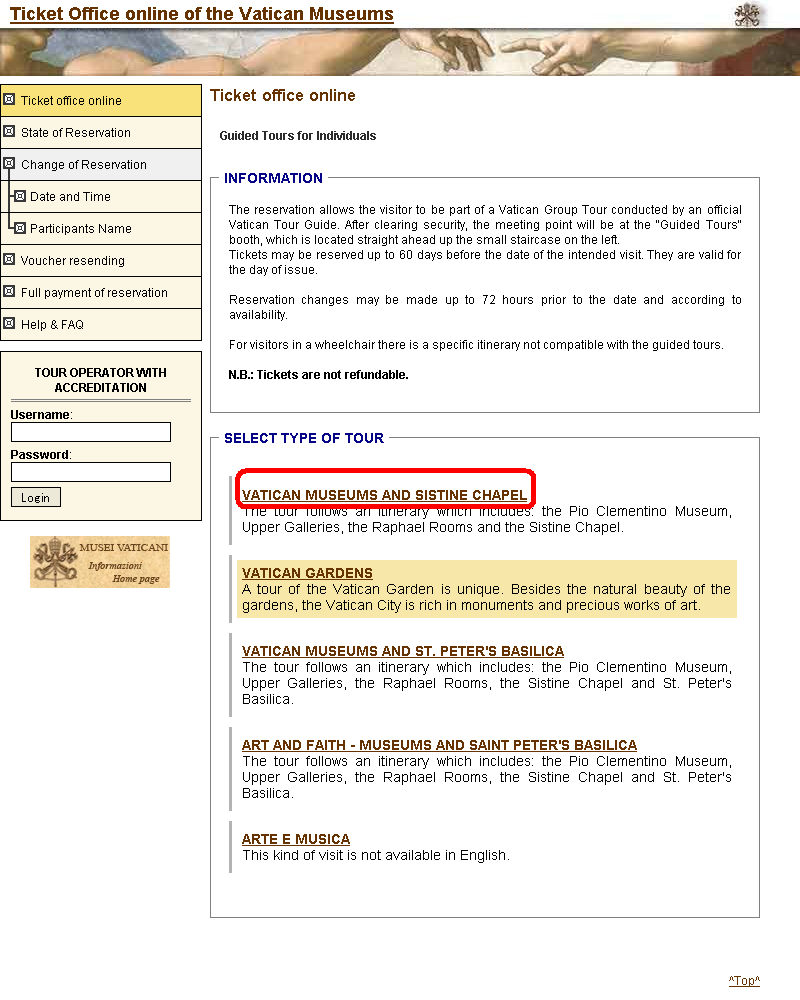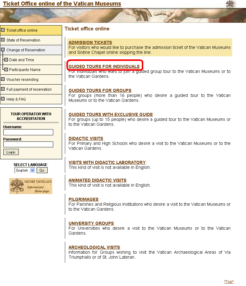 | ③ | メニュー一覧が表示される。 Admission tickets<入場券> バチカン美術館 システィーナ礼拝堂の入場券<行列に並ばなくて良い> Guided Tours for Individuals<個人のためのガイドツアー> バチカン美術館、バチカン庭園へガイドツアー この例では、<Guided Tours for Individuals>を クリック。 |