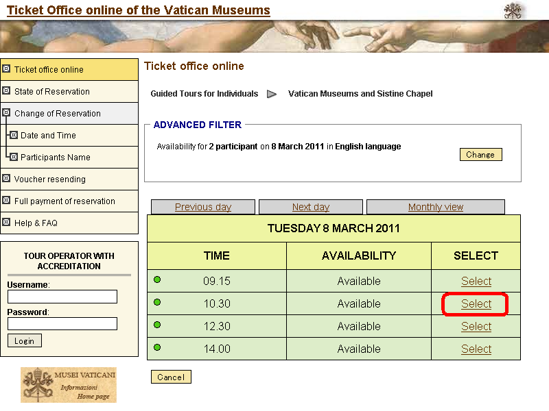 | ④ | 個人ガイドツアー の メニュー が 表示される。 この例では、<Vatican Museums and Sistine Chapel>を クリック。 |