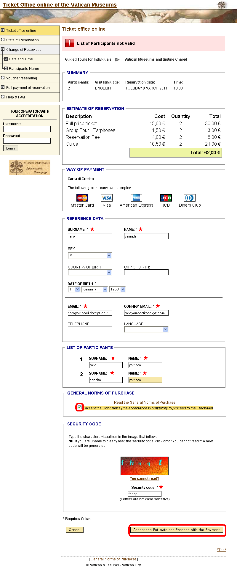 | ⑨ | 購入者情報 入力 画面が表示される。★ 印は 必須。読み難い Security Code も必須 入力後、<Accept the Estimate and Proceed with the Payment>を クリック。 |
