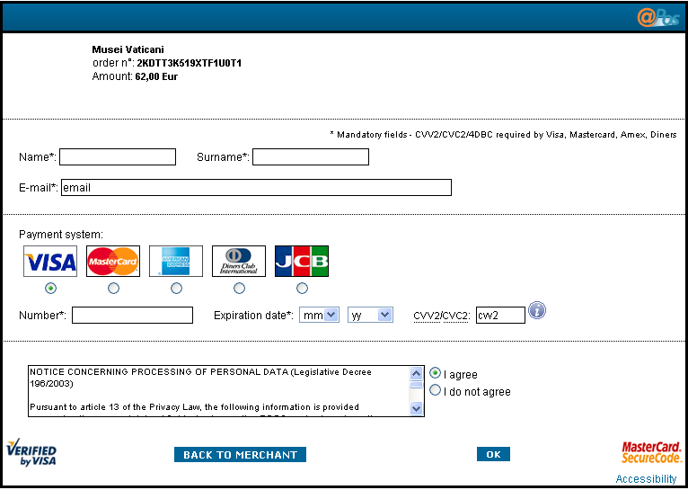 | ⑫ | 支払い情報 入力 画面が表示される。 支払いは、Credit Card のみ。 Credit Card の 種類し、カード情報を入力し、<OK>を クリック。 |