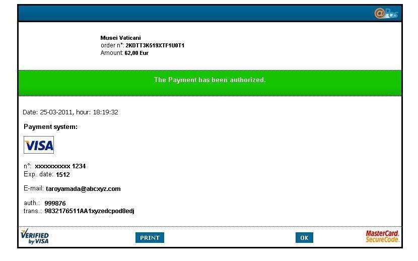 | ⑬ | Authorizeされると、この様な 画面が出る。<VISAの場合> <Print>し、<OK>をクリック。 |