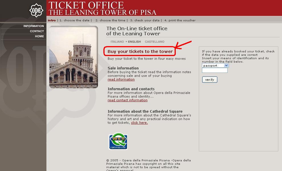| ① | Pisa 予約 Sites にアクセスする。 下の画面が出るので、<Buy Your tickets to the tower >を Click ! |