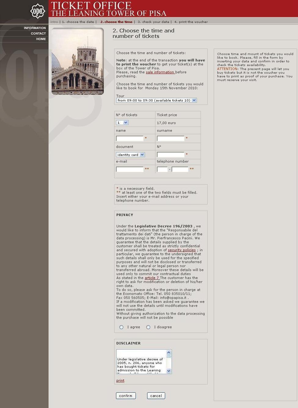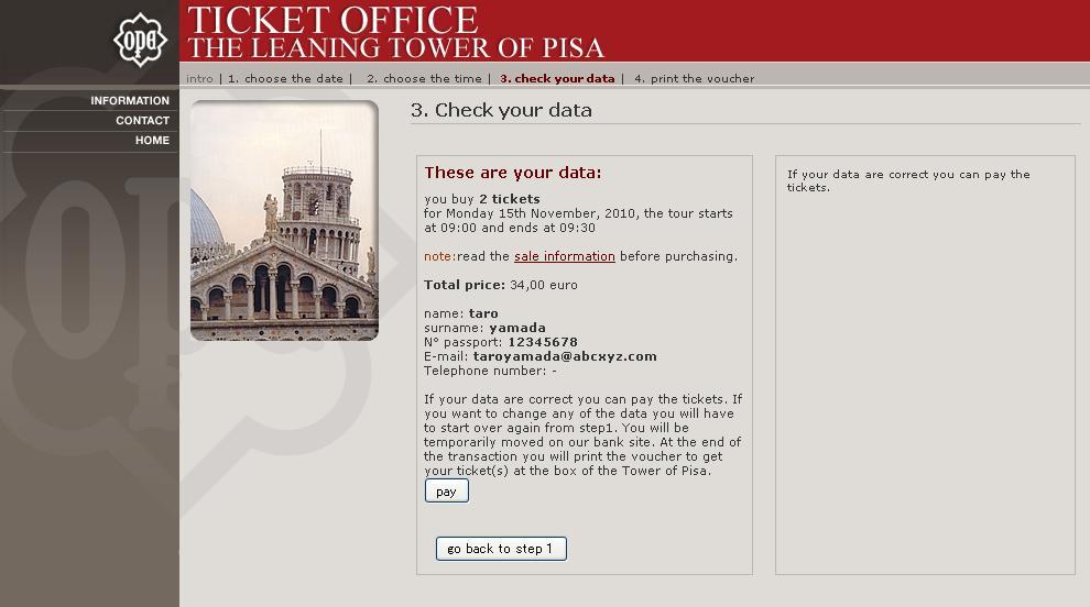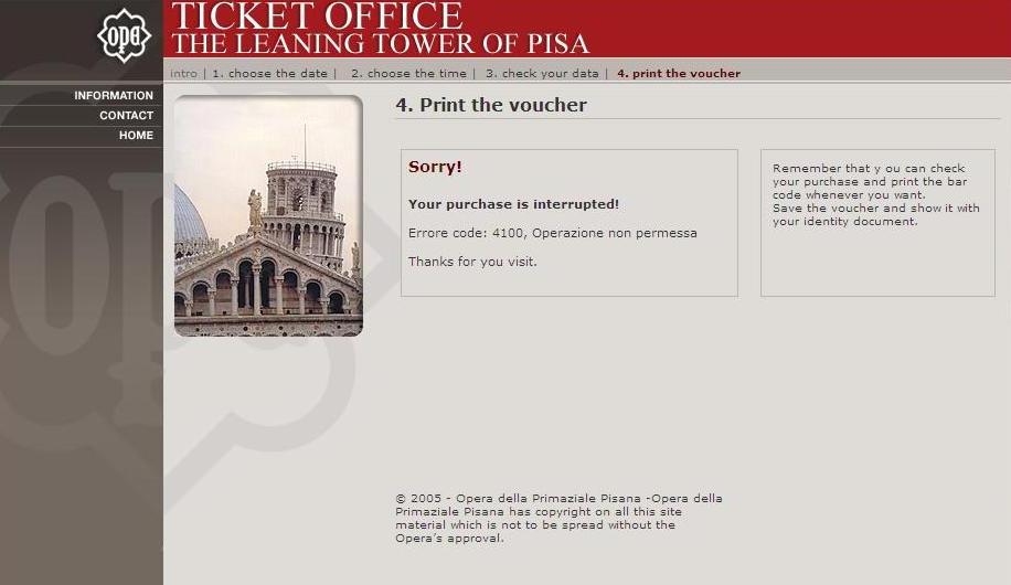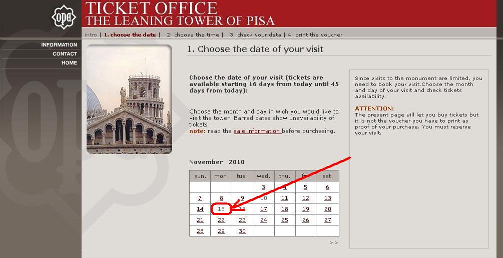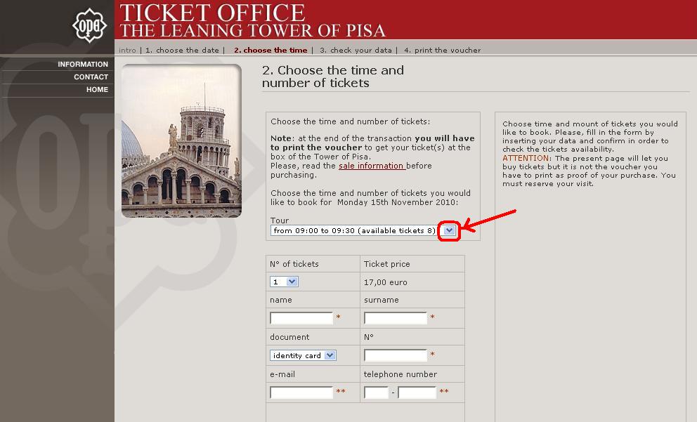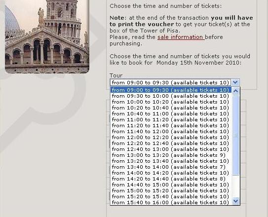 予約した入場時間の 1時間~30分前に、チケット受取る必要があります。 方法 → 斜塔 横のチケットオフィスにてバウチャーを提示し、パスポート番号を伝える。 |