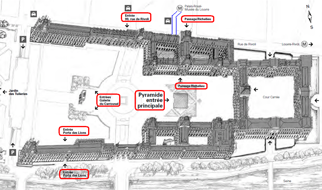 Musee du Louvre<ルーブル美術館>への、入口を選ぶことで、① を 短縮可能です。